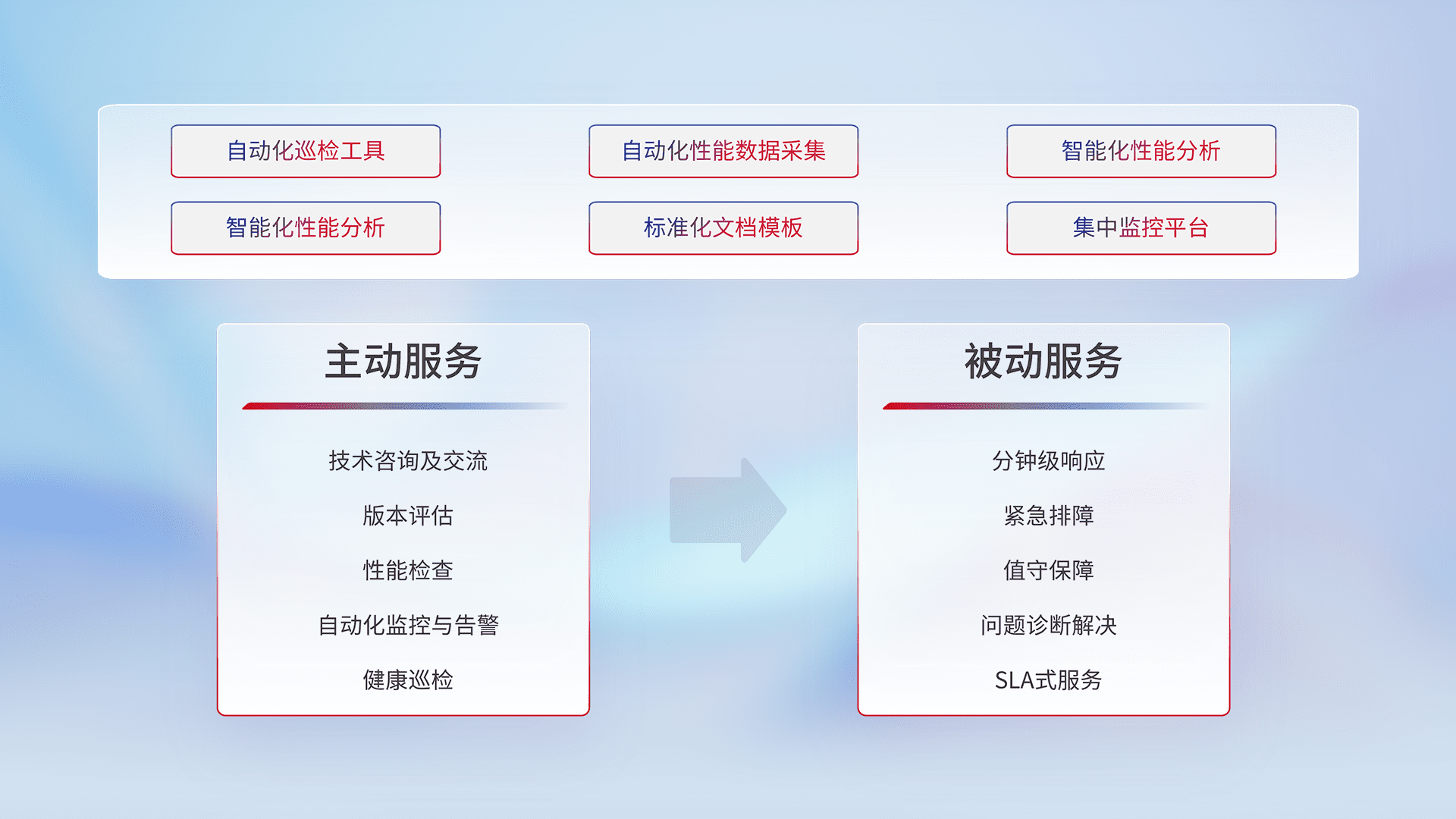 智能化工具和标准化文档,,,保障服务质量,,,提供主动服务(包含技术咨询、、、、版本评估、、、性能检查、、、、自动化监控与告警、、、健康巡检)和被动服务包含(分钟级响应、、紧急排障、、、、值守保障、、、、问题诊断解决、、SLA服务)。。。