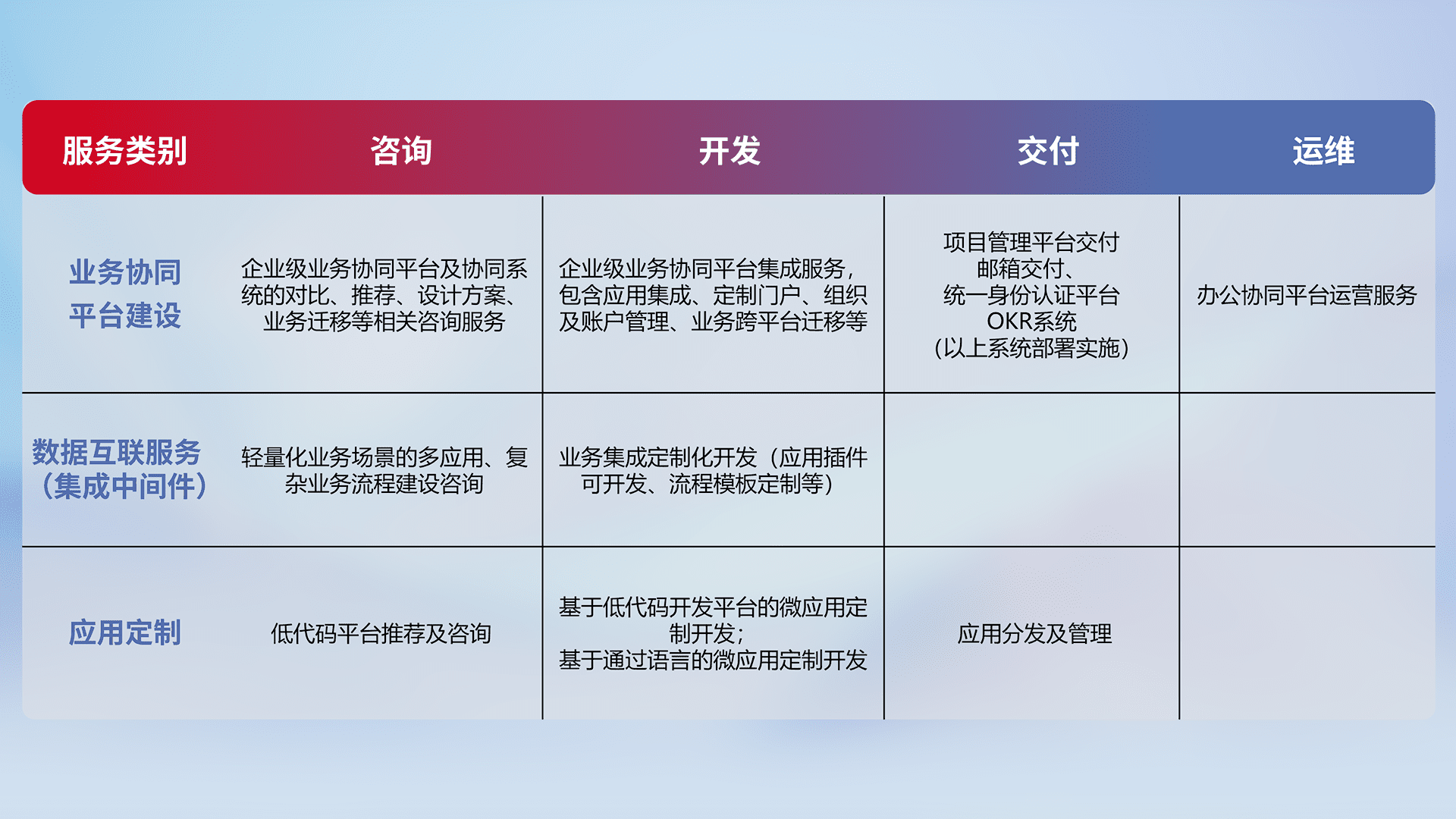针对钉钉、、、、企微、、IDaas等平台级产品提供产品的规划、、方案、、、、交付、、定制化开发等服务,,,实现如统一协同办公、、智能客户服务、、混合会议管理、、智能数据查询、、等业务场景,,,,实现数字化转型。。。